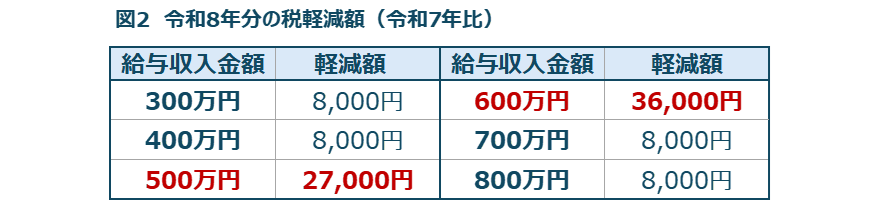 図2は、給与収入金額ごとに、令和8年分の所得税と住民税の負担が令和7年分と比べていくら軽減されるかを試算したものです。