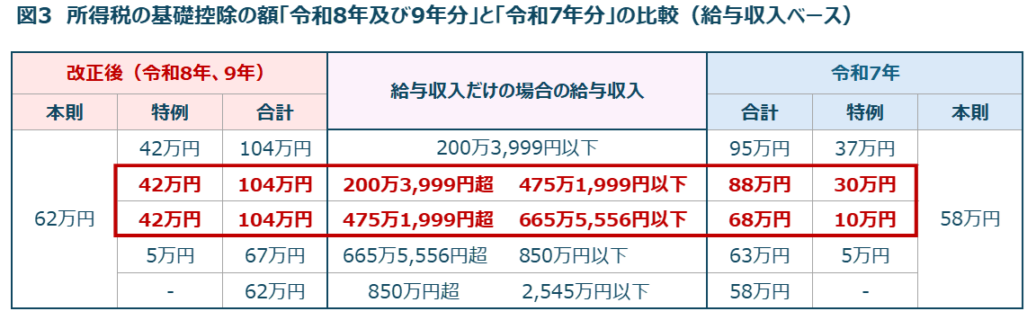 図3の赤枠内、特に給与収入金額が約475万円から約665万円の方の基礎控除額が本則の引き上げに加えて、特例分が大きく拡充されているからです。