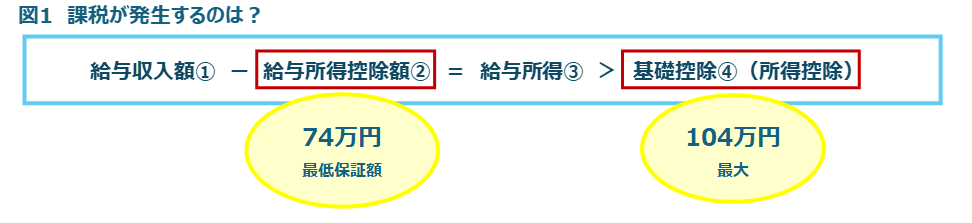 給与所得に対して課税が発生するのは、図1の給与所得③が所得控除である基礎控除④を上回る場合です。